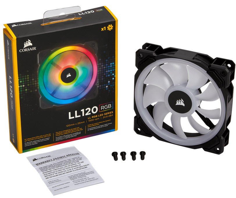 Corsair Co-9050071-Ww Ll120 Rgb Black Frame – With 16x Rgb Leds In 2 Separate Light Loops ; 120x120x25mm Advanced Hydraulic Bearing 9 Blades Pwm Fans Rubber Corners For Noise Reduction 600-1500rpm 24.8dba 43.25cfm 1.61 Mm/H2o Static Pressure