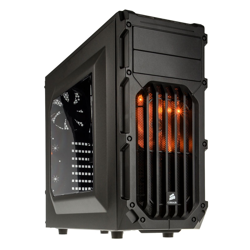 The Corsair Carbide Series SPEC-03 (Model: CC-9011054-WW) is a black, mid-tower gaming case featuring a large side panel window and distinctive orange LED lighting. It is designed for high airflow, featuring two pre-installed 120mm orange LED intake fans, and supports up to six total fan mounts.