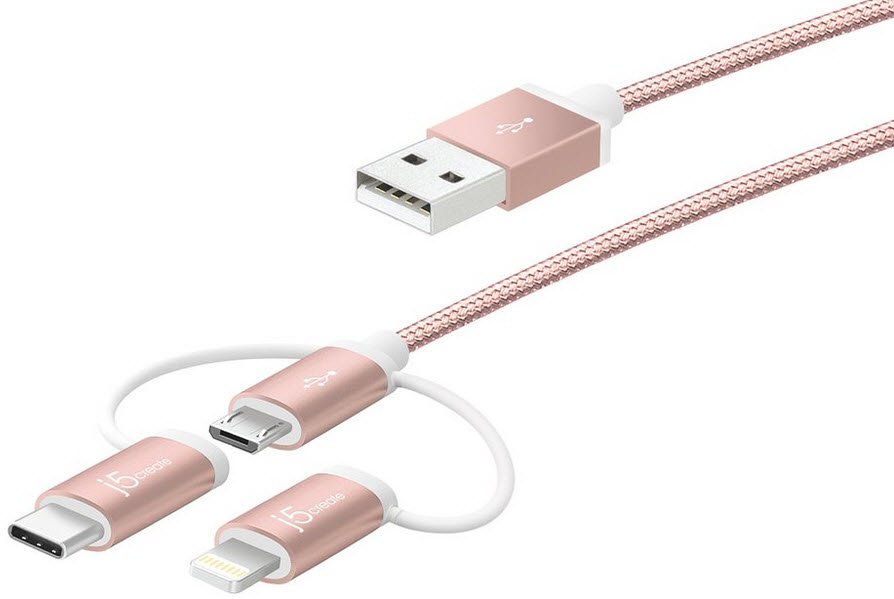 J5 Create Jmlc10 / Jmlc11 Rose Gold 3-In-1 Universable Sync+Charge Cable – Aluminum Housing + Nylon Braided Cable – Apple Mfi Certified – 100cm – Usb3.0 To Microusb + Lightning 8pins + Type-C