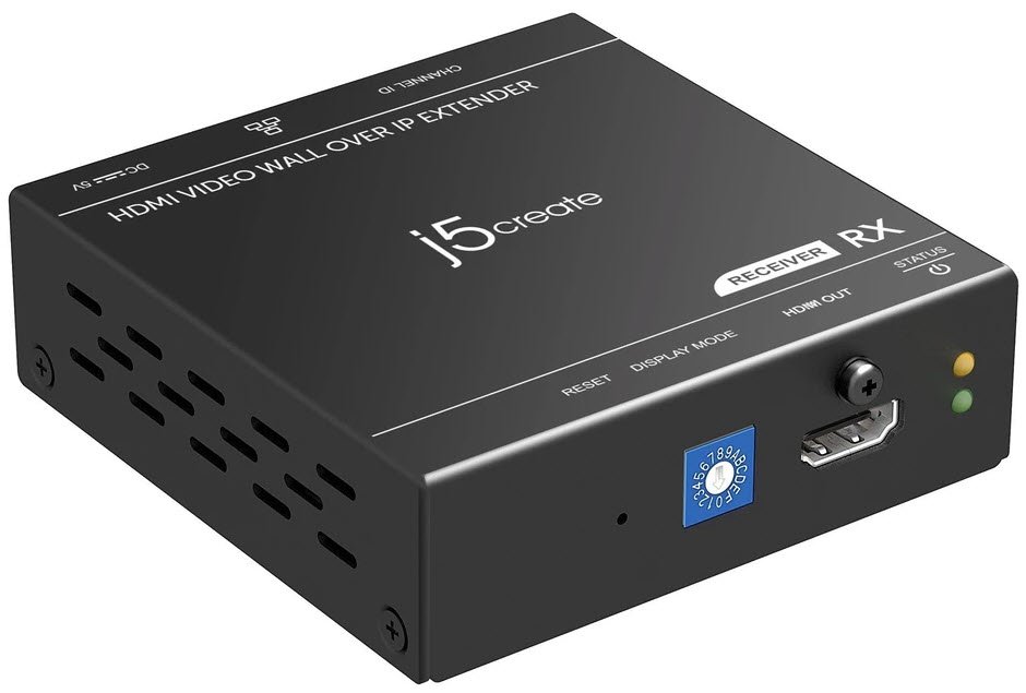 J5create Jvae52-Rx Receiver – Video Wall Over Ip Extender – Hdmi Over Utp 1080p Broadcaster Via Utp ( Rj45/Cat5e/Cat6 ) – Utp/Rj45 In + Lockable Hdmi Out 4.96 Gbps Upto 100m/1080p 10 Group Dip Switch For Tx-Rx Pairing 16-Position Video Display Config